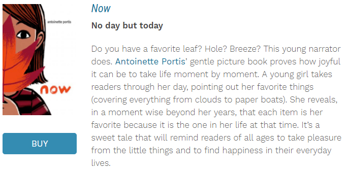 The book’s ending ushers in an adult, assumed to be a parent, and smartly, subtly invites readers to appreciate their own moment of now, as we see the adult reading to the girl. This “now” is the girl’s favorite because she’s sharing it with this adult. Can the reader do the same? Only if they’ve been paying attention to Portis’ wise sentiment and eloquent story.