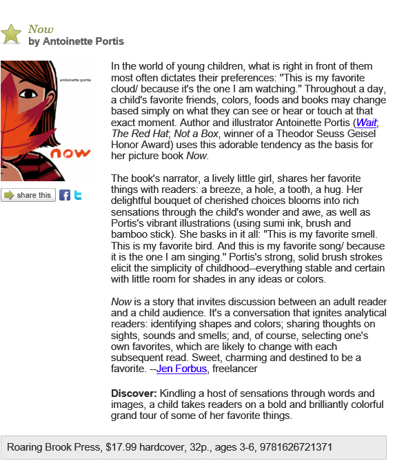 Mindfulness, captured beautifully Antoinette Portis’s joyful picture book Now (Roaring Brook, Ages 2-6) perfectly captures a child’s lighthearted affection for the here and now. The book, by the author of the award-winning “Not a Box,” begins with a young girl dancing in the wind, hands in the air: “This is my favorite breeze.” A leaf, a hole in the sand, rain, a missing tooth — the girl declares each her favorite in an exuberant, unstudied celebration of small experiences both concrete and abstract. Bright red endpapers and the sturdy bold lines in these lively illustrations invite readers to pay attention, to feel that they are part of what’s happening. With each turn of the page, one moment gives way to another, and the repeated words, “this is my favorite,” come together to form a kind of poem. Some of the girl’s beloved objects are quite funny and demonstrate with simplicity that “now” is fleeting. “This is my favorite rain,” says the girl, in blue boots, launching a paper vessel. “That was my favorite boat,” she says as it slips away in the flowing water. “This is my favorite tooth,” says the girl as she holds a tooth and smiles to show off her gap, “because it is the one that is missing.” As the child names and declares each of these her favorites, their evanescence gives way to a lasting sense of delight. Even the very youngest listener will enjoy both the satisfaction of listmaking and the immediacy of this delicious, effervescent embrace of the moment.